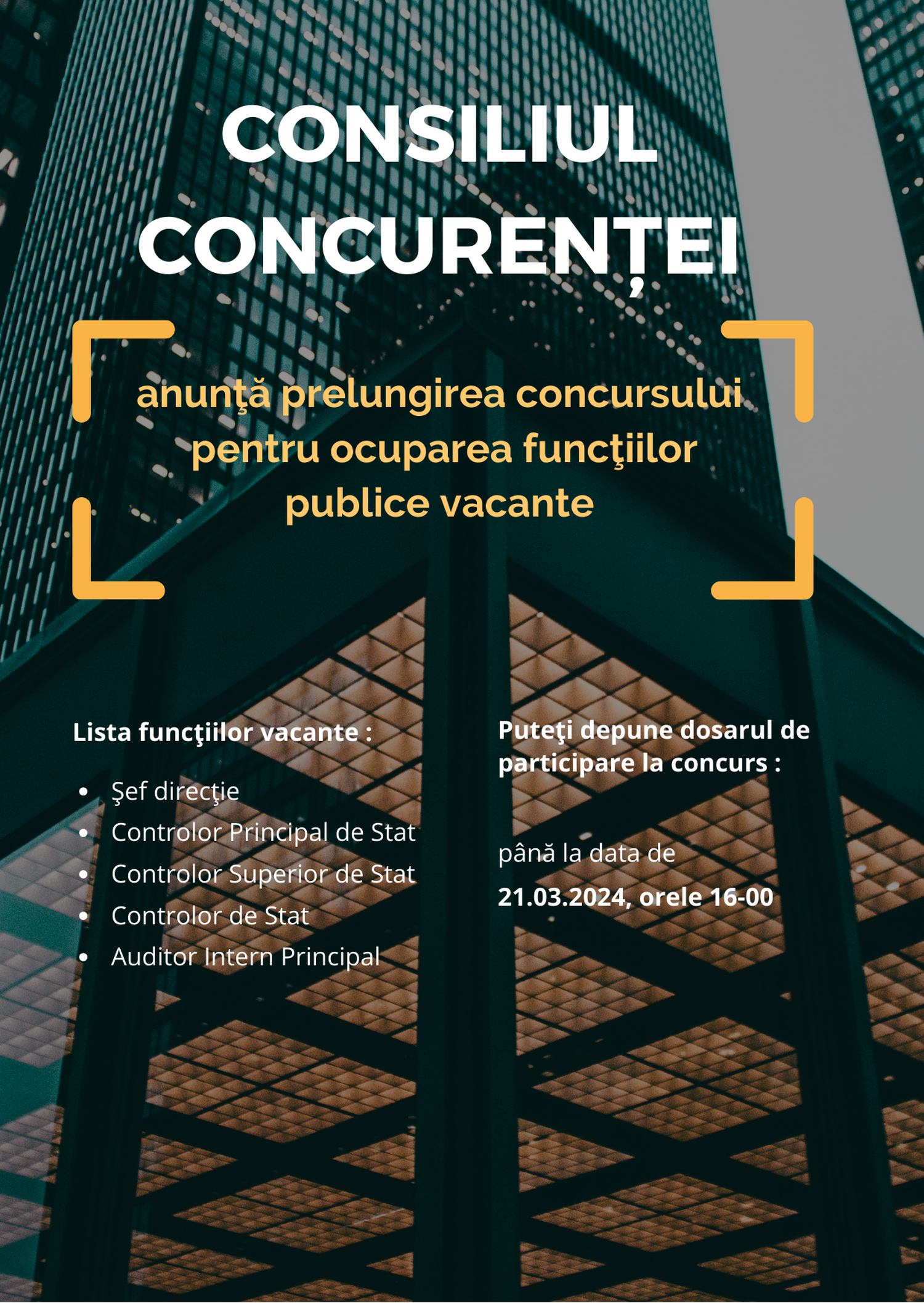Persoanele interesate pot depune dosarul de participare la concurs personal în zilele de luni-vineri, ora 8:00 - 16:00, cu pauză de prânz de la 12:00 - 13:00 la sediul Consiliului Concurenței, prin poșta electronică (resurse.umane@competition.md) sau oficiul poștal Lista funcțiilor publice vacante, sarcinile de bază și cerințele funcționale le puteți vizualiza accesând linkul Data limită până la care poate fi depus dosarul de concurs 21 martie 2024 orele 16-00