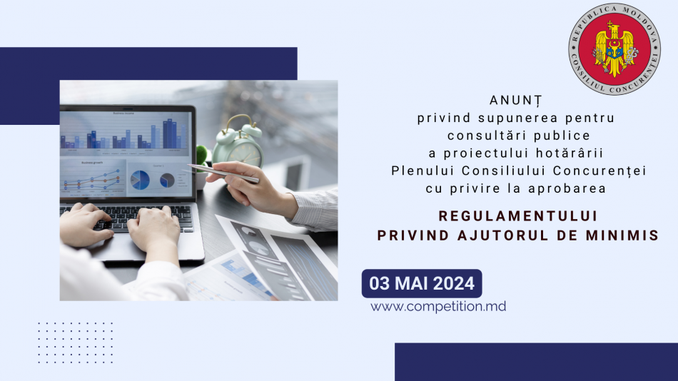 Consultări publice a proiectului hotărârii Plenului Consiliului Concurenței cu privire la aprobarea Regulamentului privind ajutorul de minimisConsiliul Concurenței, în temeiul art. 32 alin. (3) din Legea nr. 100/2017 cu privire la actele normative, supune consultării publice proiectul hotărârii Plenului Consiliului Concurenței cu privire la aprobarea Regulamentului privind ajutorul de minimis. Propunerile și recomandările părților interesate pe marginea proiectului Regulamentului supus consultării publice, pot fi prezentate Consiliului Concurenței până la data de 03.05.2024, la adresa de mail: office@competition.md. Persoana de contact: Olesea LUNGU, tel: 076060183, (022)273743, Direcția Evidență și Raportare a Ajutorului de Stat. Link: Proiectul Regulamentului privind ajutorul de minimis
