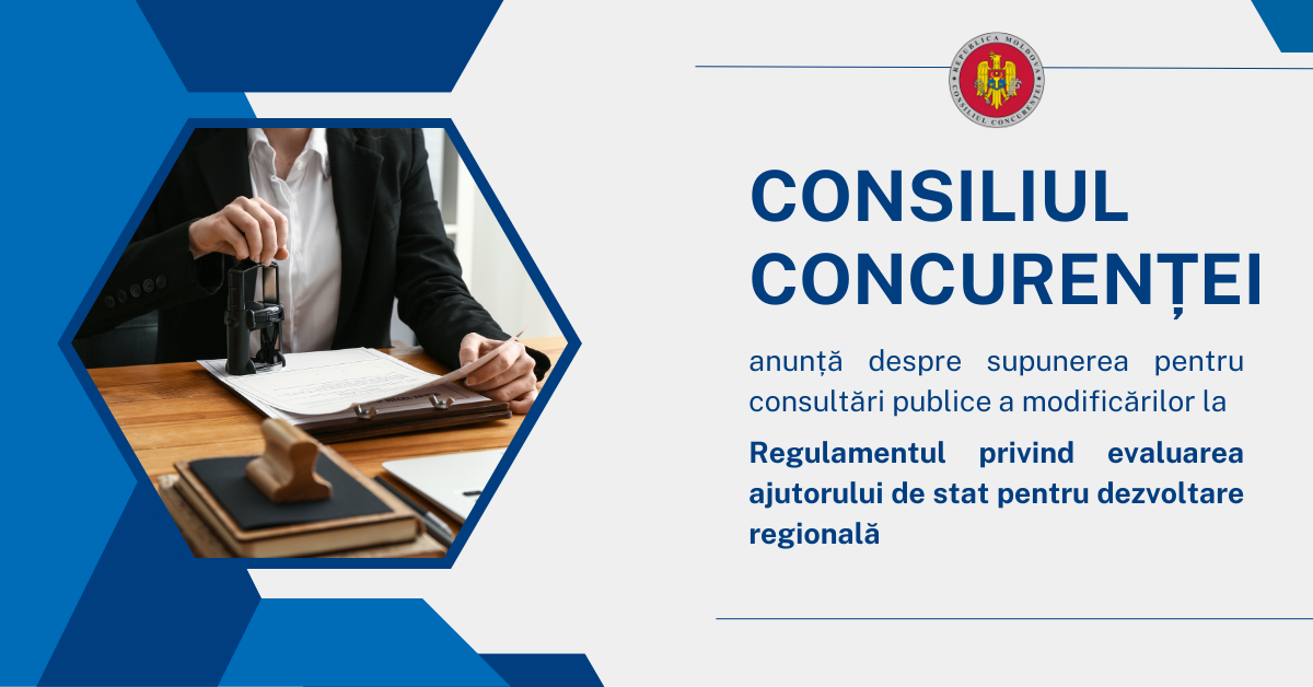 Consiliul Concurenței, în temeiul art. 32 alin. (3) din Legea nr. 100/2017 cu privire la actele normative, supune consultării publice proiectul Hotărârii Plenului Consiliului Concurenței pentru modificarea Hotărârii Plenului Consiliului Concurenței nr. 02/2020 cu privire la aprobarea Regulamentului privind evaluarea ajutorului de stat pentru dezvoltare regională. Propunerile și recomandările părților interesate pe marginea proiectului supus consultării publice pot fi prezentate Consiliului Concurenței până la data de 31.07.2024, la adresa de mail: office@competition.md. Persoana de contact: Valeriu BURLEA, tel: 076060182, Direcția Ajutor de Stat pentru Dezvoltare Regională, Olesea LUNGU, tel: 076060183, Direcția Evidență și Raportare a Ajutorului de Stat. |